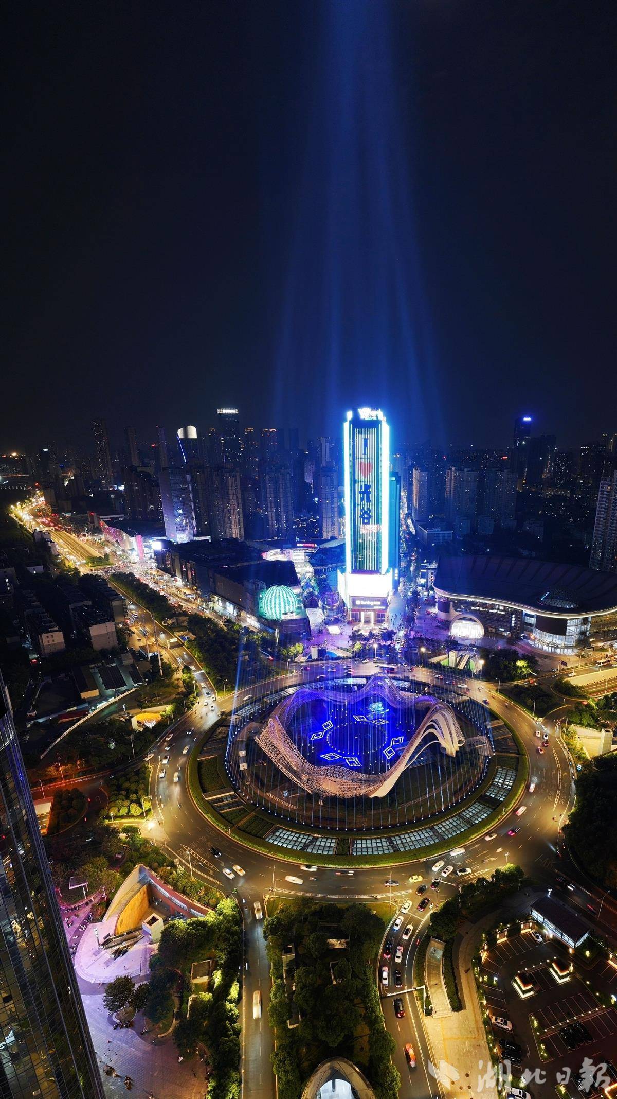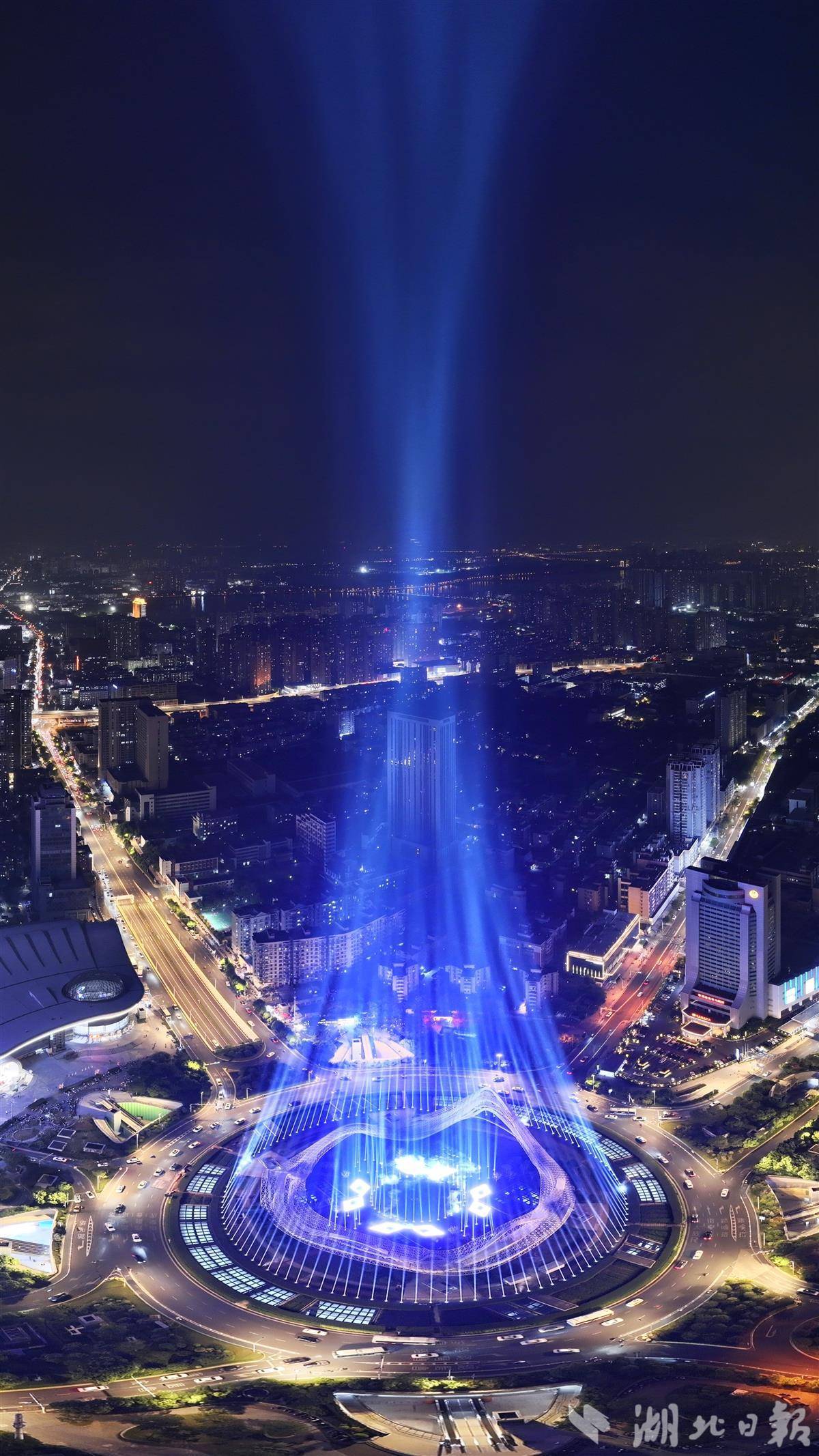 设计师重构光束几何形态,372组光束灯在纵深800米的三维空间内协同运作,以动态光网构筑"宇宙矩阵"。精准复刻《流浪地球》行星发动机启动特效。高空视角下,光轨交织成壮阔图景,实现了科幻场景的立体化呈现。(湖北日报全媒记者 陈少哲 摄)