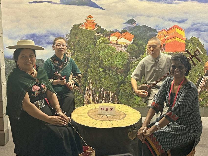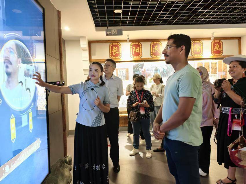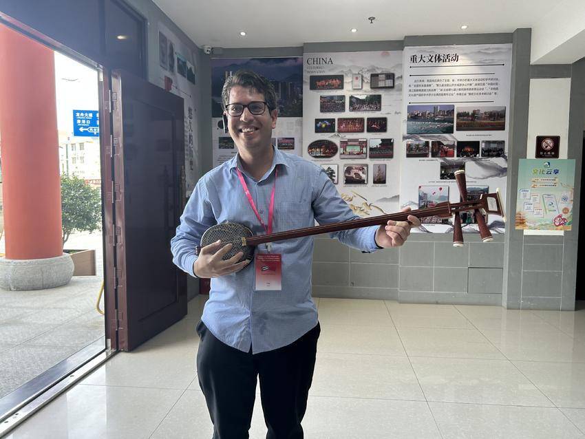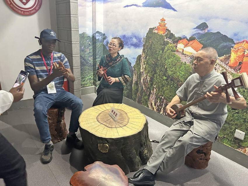 在非遗馆内,讲解员以生动的讲述,为外国友人们揭开了土家文化的神秘面纱。当悠扬的土家山歌在展厅响起时,大家情不自禁地跟随旋律打起节拍。在南曲展示区,非遗传承人指尖流淌的淙淙琴音与清亮唱腔,更让来宾驻足聆听、深深着迷。