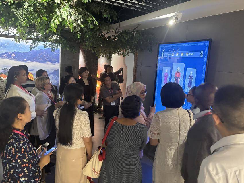 最受欢迎的莫过于服饰互动区的电子换装体验环节,传统服饰与数字科技的巧妙融合,让文化体验变得鲜活而有趣。借助动态捕捉技术,外国友人们纷纷化身“数字土家人”。每当虚拟形象生成的一刻,现场便响起阵阵欢笑与掌声。