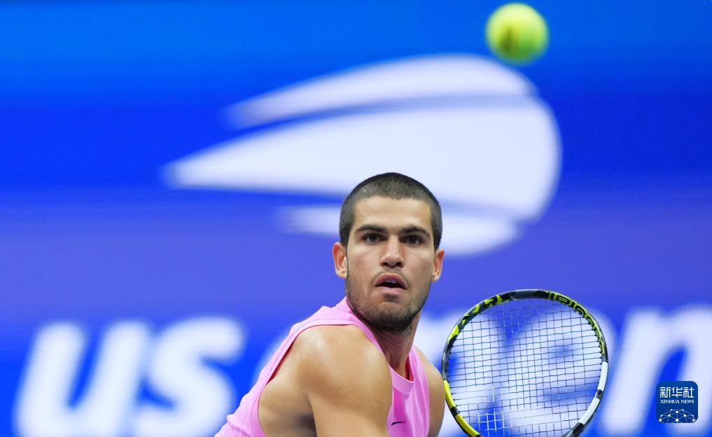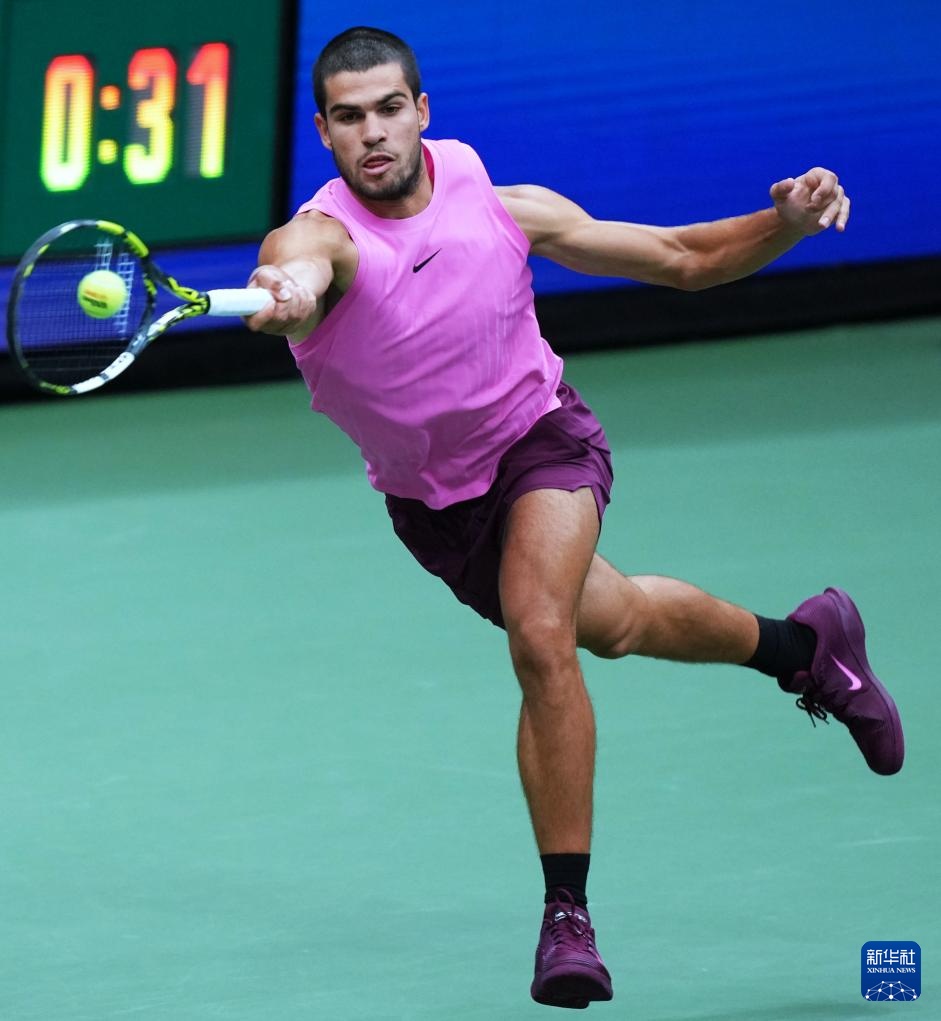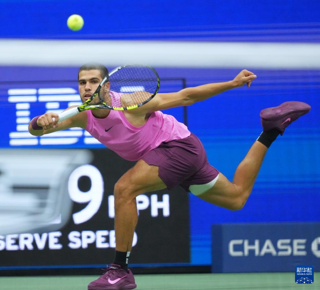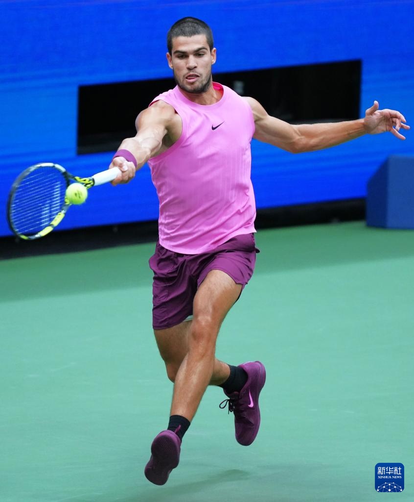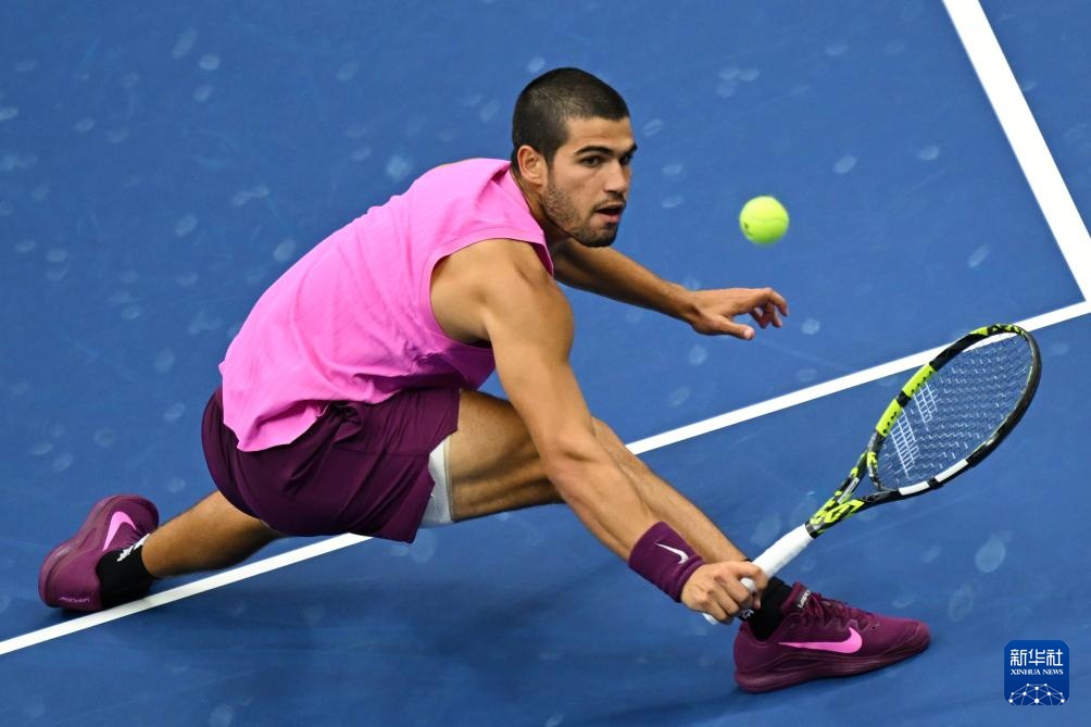 9月7日,阿尔卡拉斯在比赛中回球。