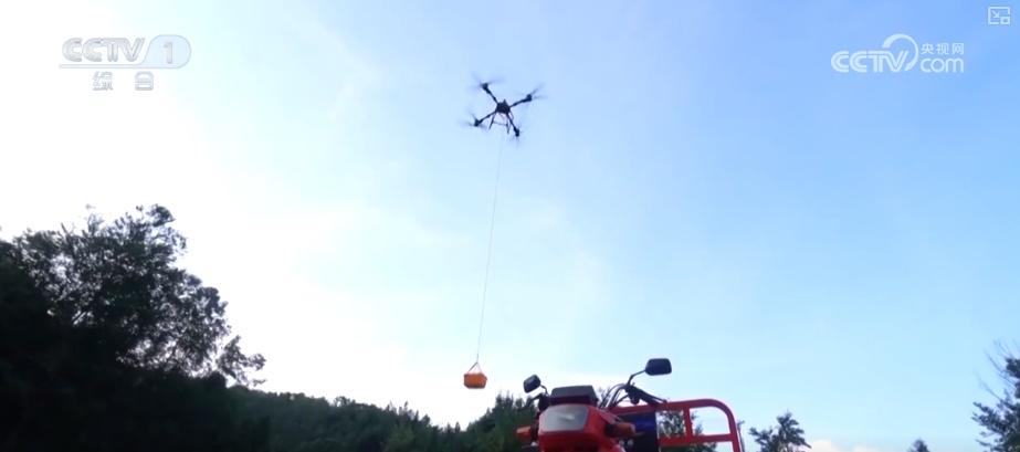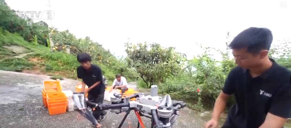这个果园距离山下有600米,以往山上的水果如果想要运下山,只能靠农用三轮车经过四五十分钟的时间,走长达3000多米颠簸崎岖的山路运下山。现在,他们采用重载无人机“点对点”直接调运下山,时间只需要10分钟。