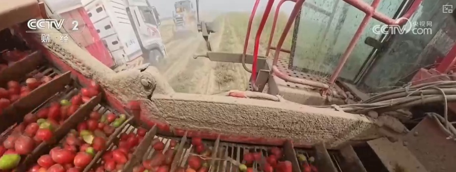这个过程中,采收机内安装的色选仪会通过对青、红两种不同颜色的番茄进行智能化识别,自动将没有成熟的青番茄“弹”出,只保留成熟的红色番茄,确保加工环节的原材料质量,识别率达97%。