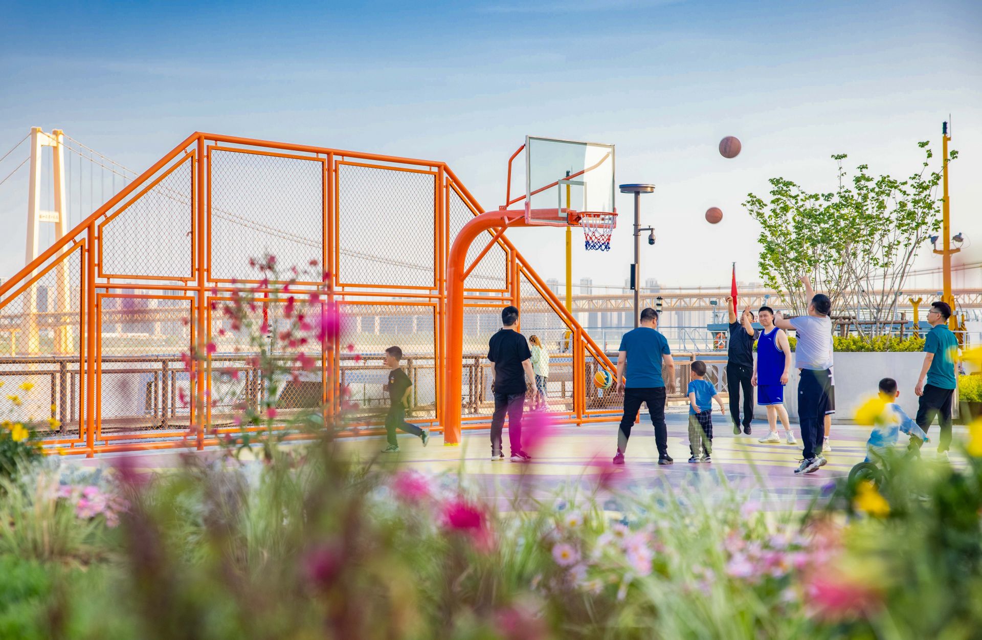 武汉杨泗港都市T台,市民在“国风”篮球场休闲运动。(湖北日报全媒记者 薛婷 摄)