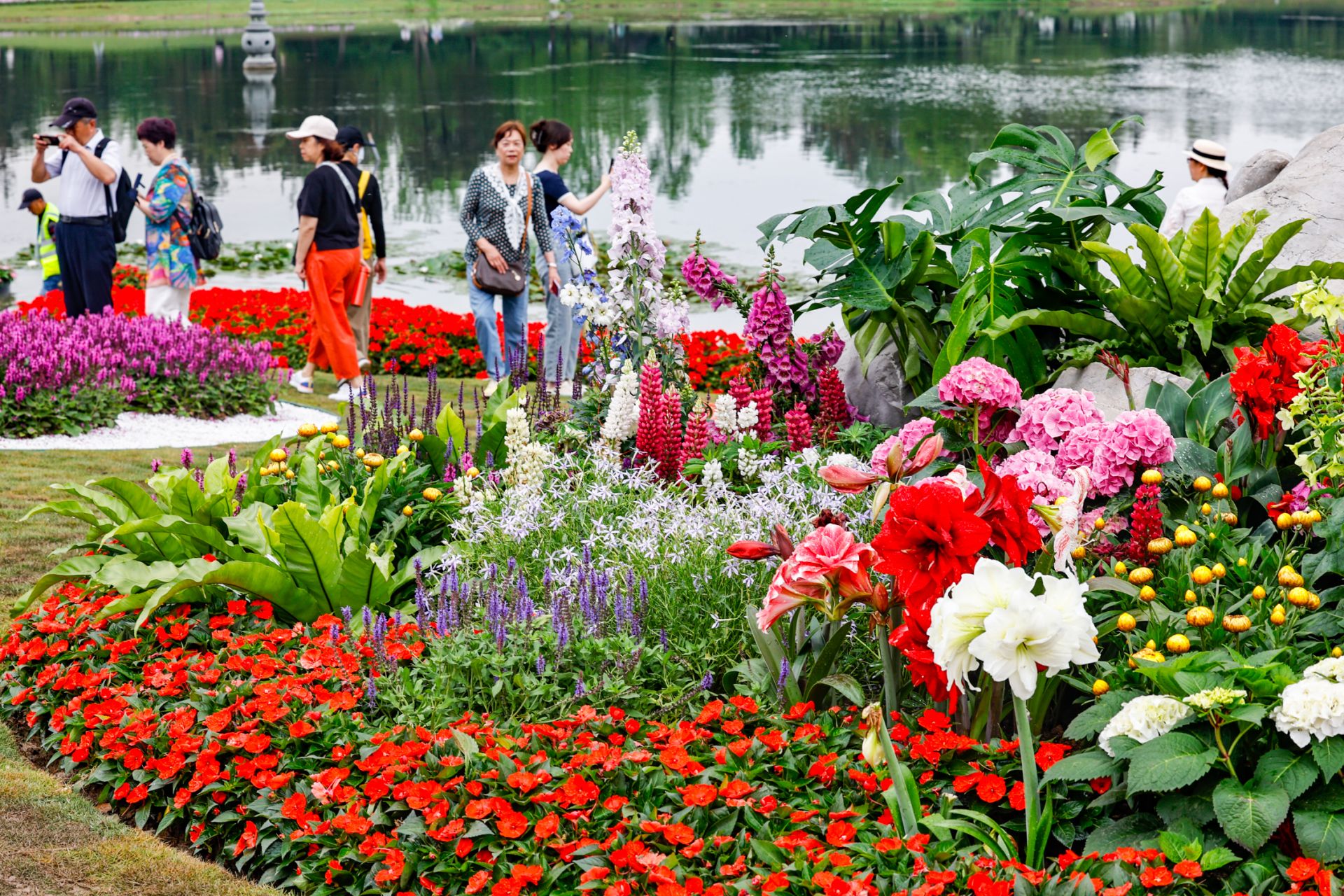 2024年4月28日,在武汉园博园世界花园大会武汉会场开幕式现场,各色鲜花竞相绽放,市民游客穿梭于各展区之间,拍照打卡。(湖北日报全媒记者 倪娜 通讯员 徐志刚 摄)