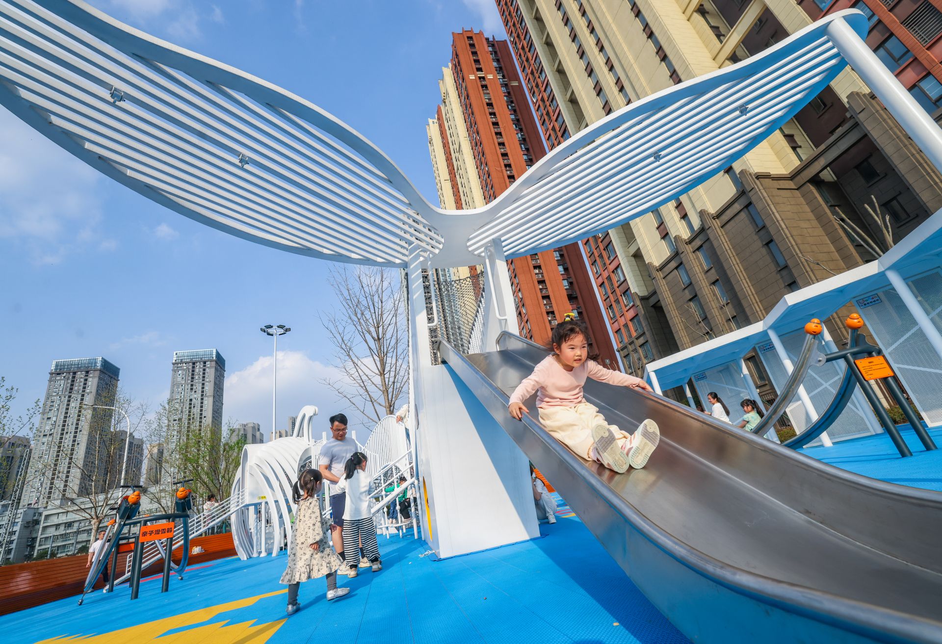 武汉江汉区,孩子们在近日投用的远洋鲸奇儿童友好公园内玩耍。(湖北日报全媒记者 薛婷 摄)