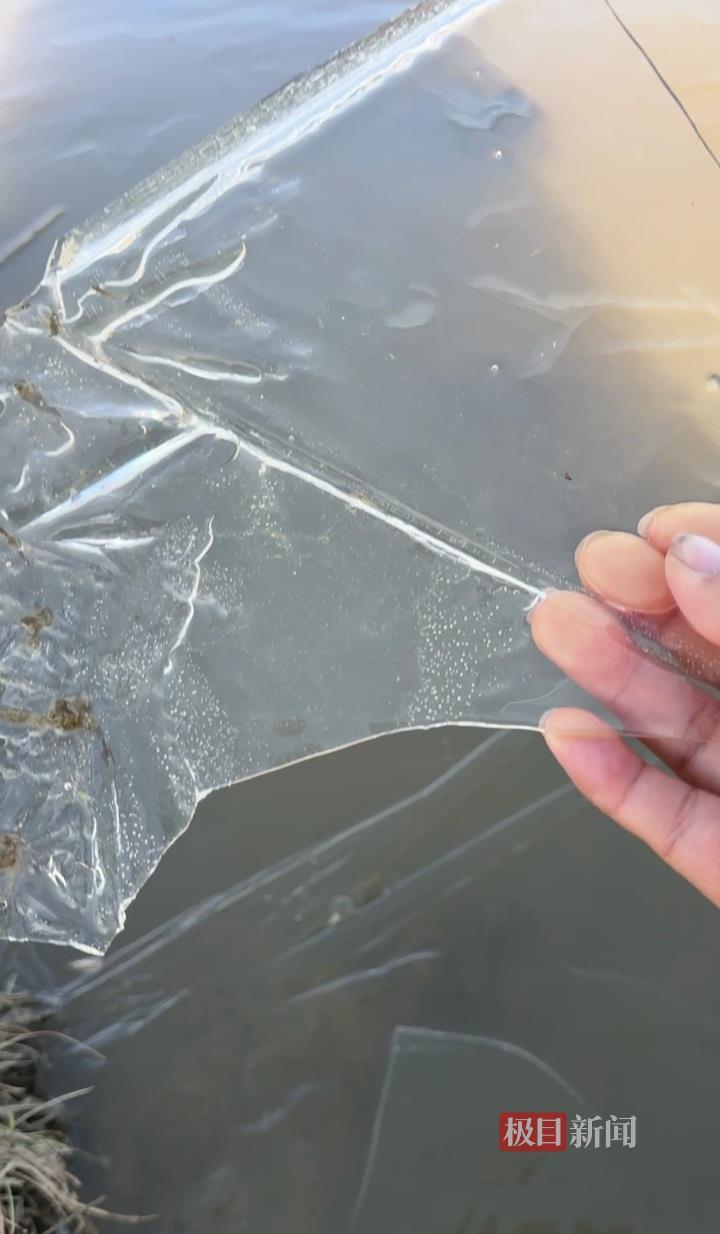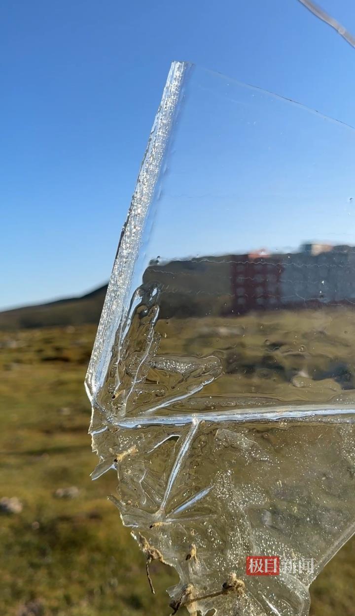 8日上午6时许,一支徒步队伍迎着五台山顶的日出,从中台顶往北台顶行进。队伍行至万圣澡浴池寺附近,徒步者偶然发现山顶的一个小水坑反光,有人弯腰戳了一下水面,发现水面上结了一层薄冰,稍稍用力就戳破冰面。