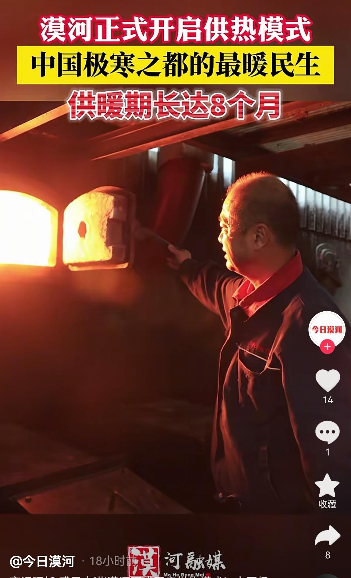据了解,漠河冬季最低气温曾达到零下53摄氏度,是全国供暖时间最早、周期最长的地区之一,供暖期长达8个多月,将持续到明年5月中下旬。