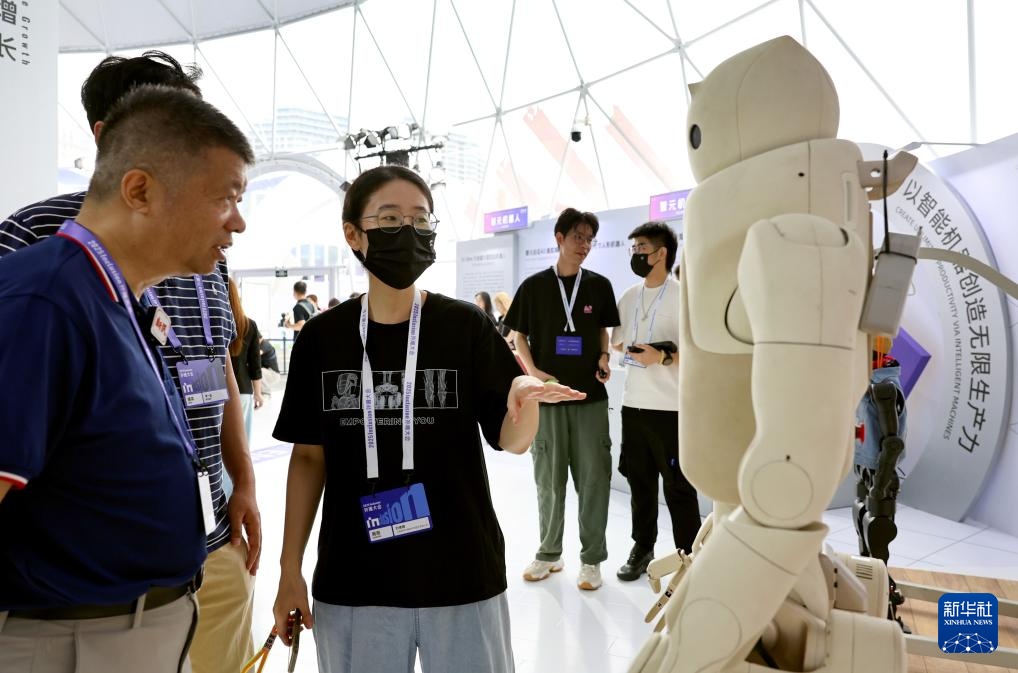 9月10日,工作人员(中)向参观者介绍一款具备触感反馈功能的人形机器人。