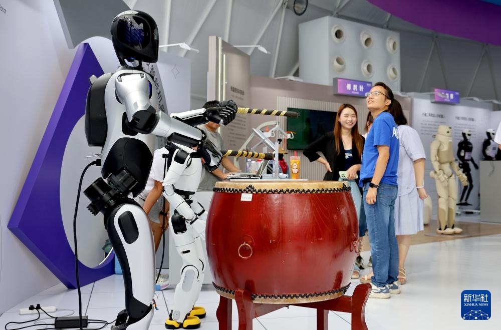 9月10日,机器人小镇展区的机器人在表演敲鼓。