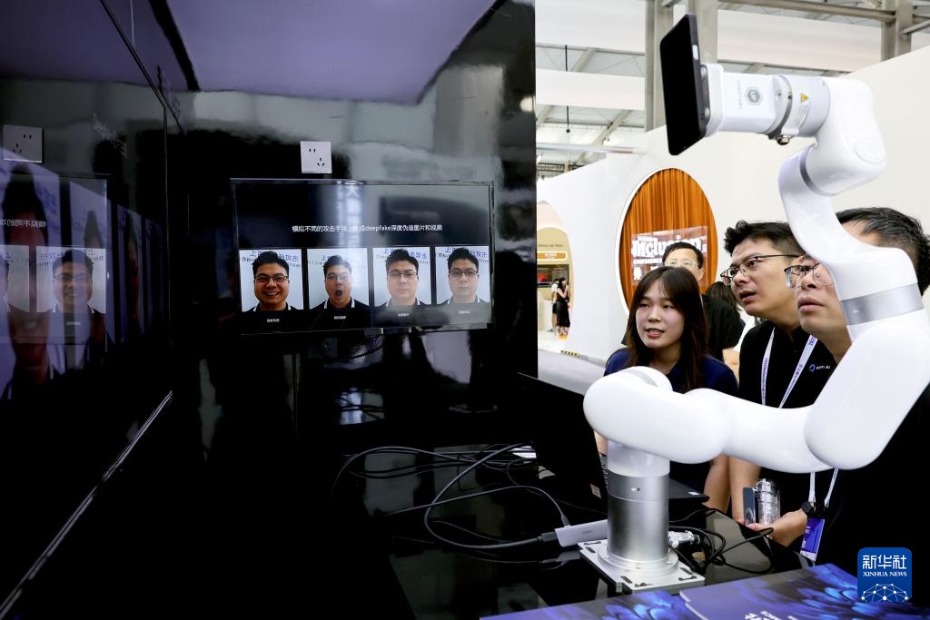 9月10日,参观者在一个甄别AI换脸技术的演示设备前驻足观看。