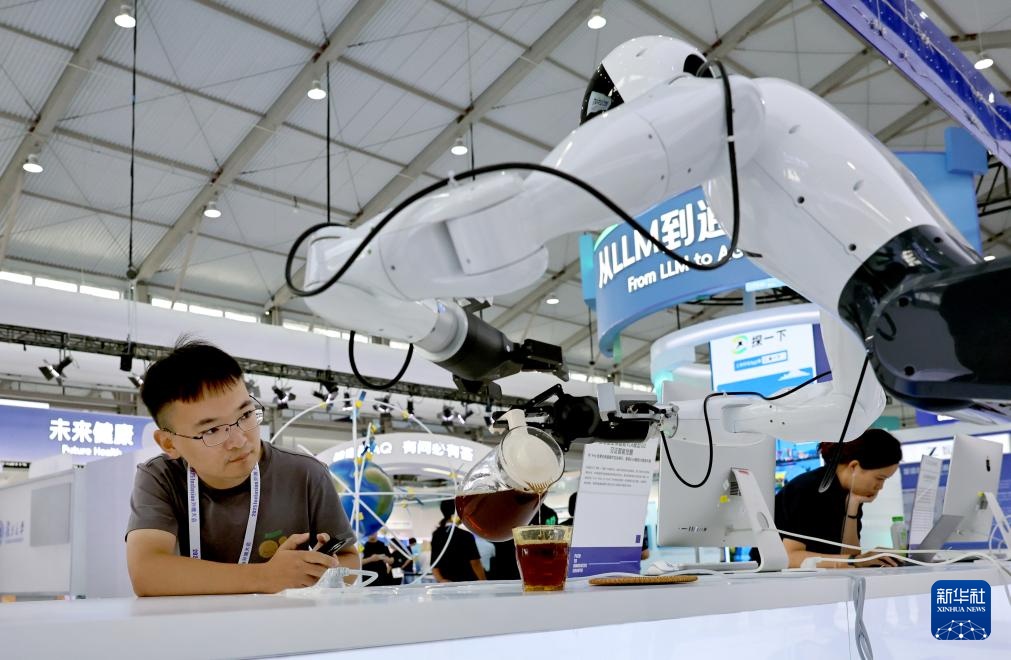 9月10日,参观者观看机器人演示饮品服务。