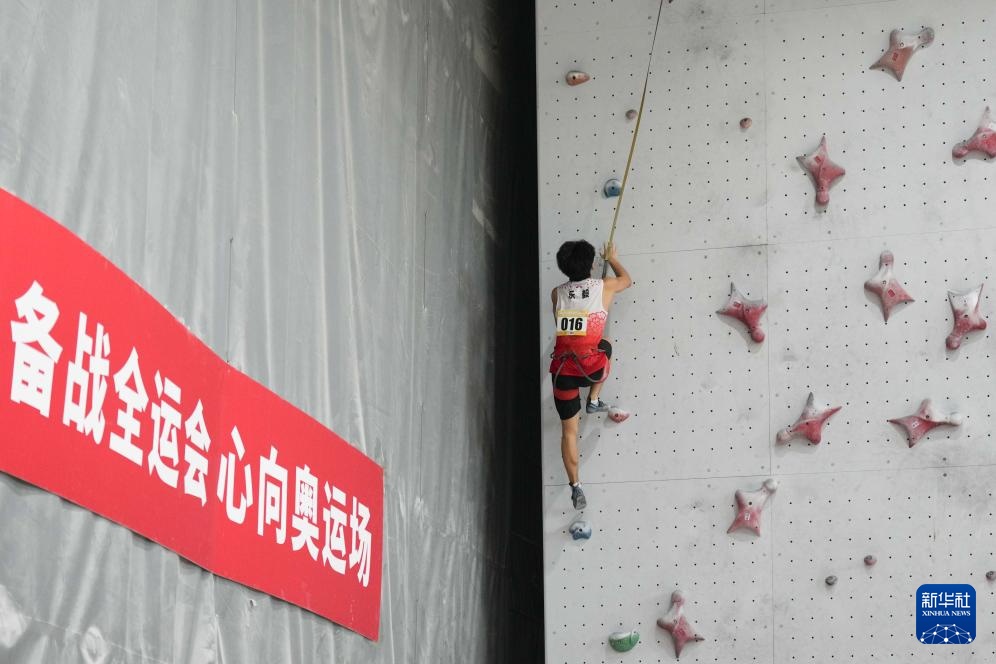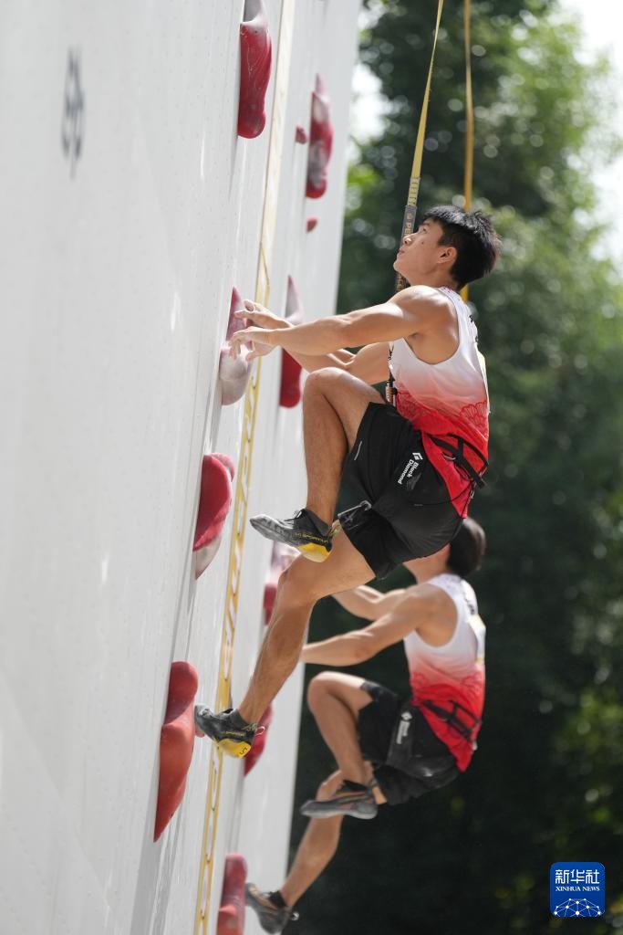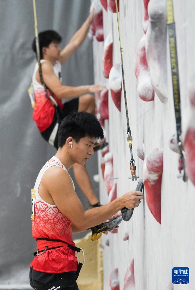 9月10日,湖南黄金攀岩队选手、2024巴黎奥运会攀岩男子速度赛亚军伍鹏(前)在比赛中。