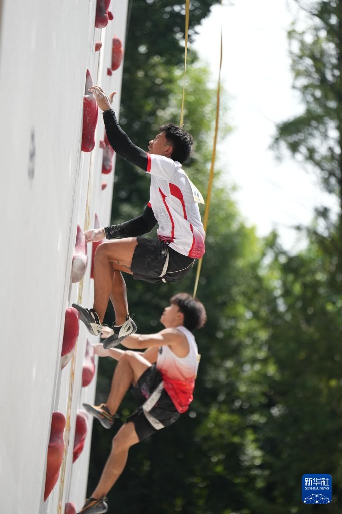 9月10日,湖南黄金攀岩队选手、成都世运会攀岩男子速度、男子接力冠军储守宏(上)在比赛中。