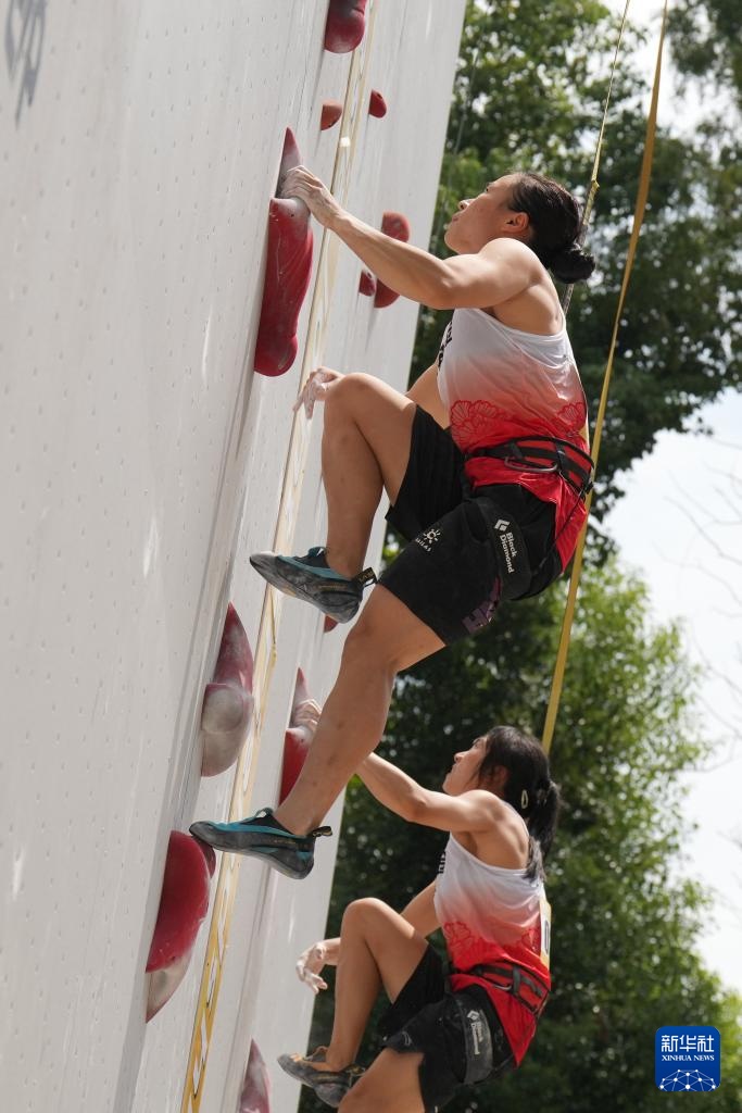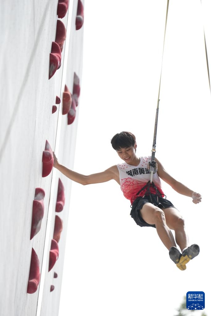 9月10日,湖南黄金攀岩队选手、2024巴黎奥运会攀岩女子速度亚军、成都世运会攀岩女子速度、女子接力冠军邓丽娟(上)在比赛中。