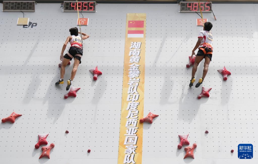 9月10日,印度尼西亚选手马德·里塔·库苏马(左)与中国湖南黄金攀岩队选手、2024巴黎奥运会攀岩女子速度亚军、成都世运会攀岩女子速度、女子接力冠军邓丽娟在比赛中。