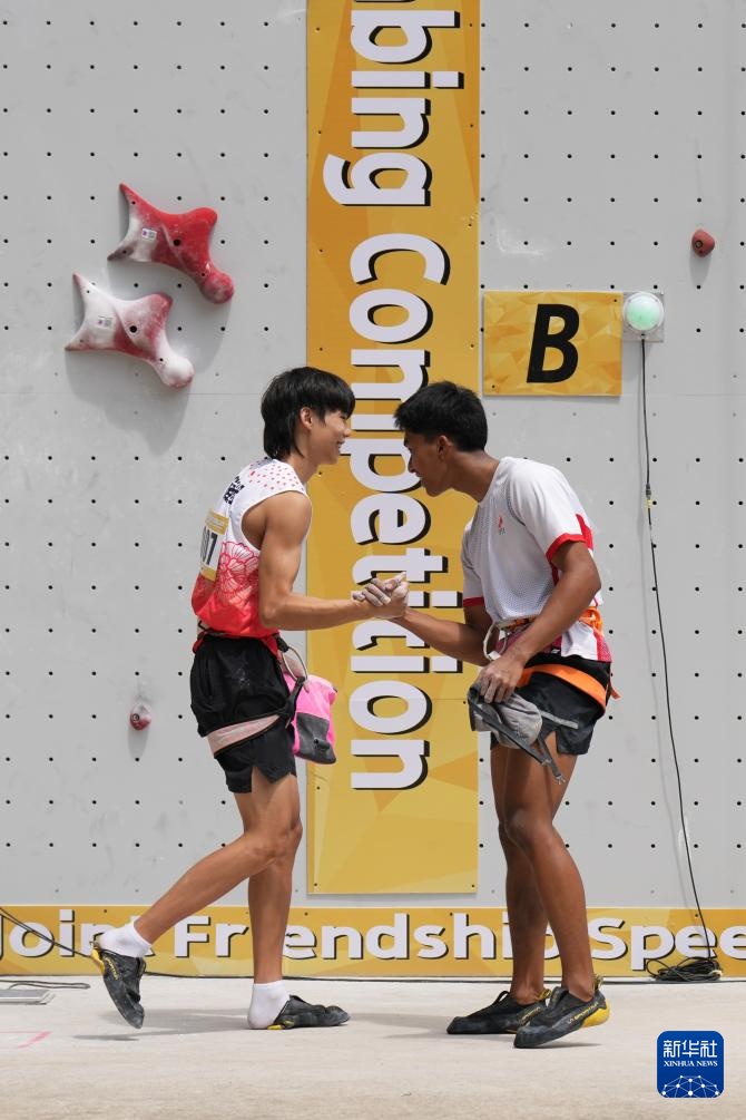 9月10日,中国湖南黄金攀岩队选手、第十四届全运会攀岩男子速度冠军龙金宝(左)与印度尼西亚选手安塔斯亚菲·罗比·阿尔·希尔米在比赛后握手。