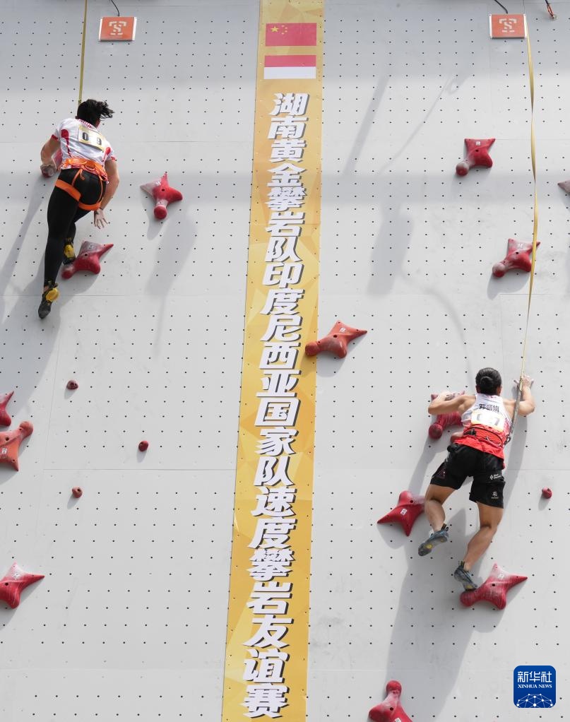 当日,中国湖南黄金攀岩队与印度尼西亚国家攀岩队速度组在湖南省体育场攀岩场举行了一场速度攀岩友谊赛。此次友谊赛采用国际标准速度赛道,模拟实战环境,旨在通过"以赛代练"的方式,进一步提升运动员的竞技状态和临场应变能力,为湖南队备战全运会提供强力支撑。