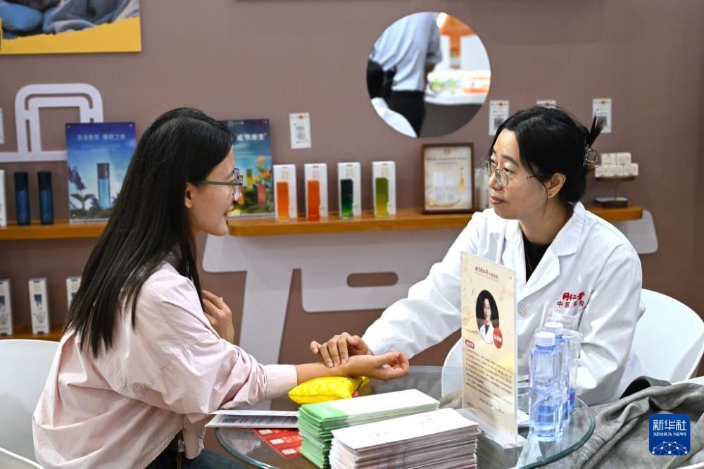 9月10日,参展者(左)在服贸会健康卫生服务展区体验中医问诊。