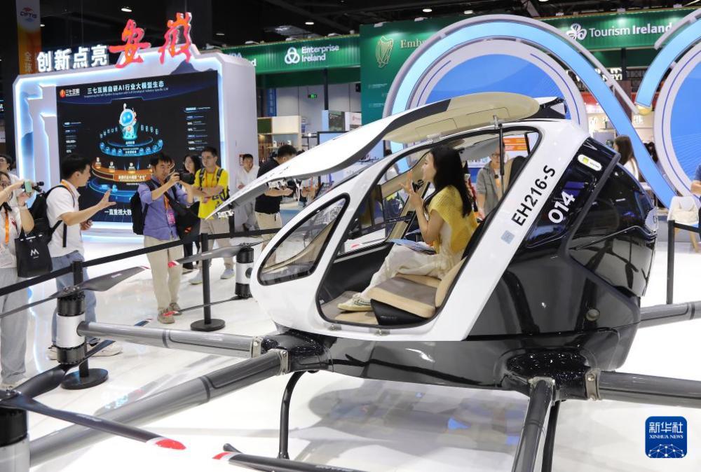 9月10日,在2025年服贸会主题展展区,一名媒体人员(右)在主宾省安徽省展台体验了解无人驾驶载人电动垂直起降航空器。