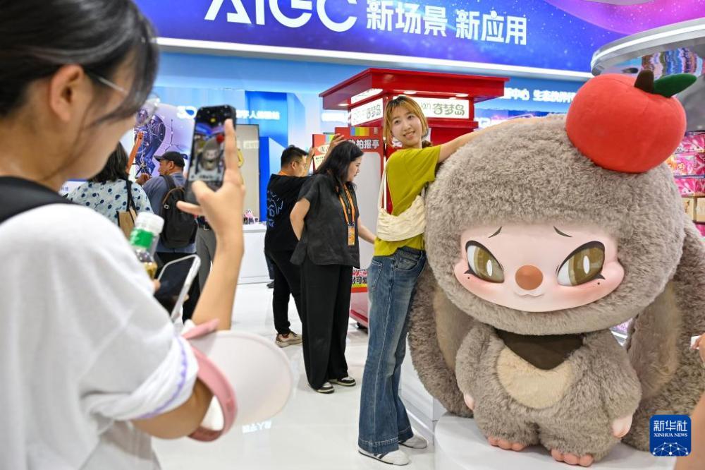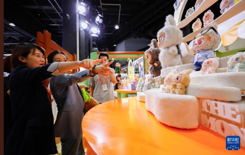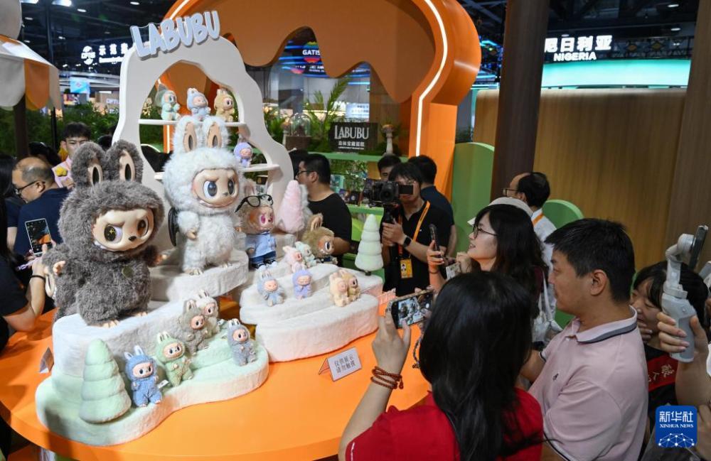 9月10日,在2025年服贸会主题展展区,参会人员在泡泡玛特展台与LABUBU玩偶合影。