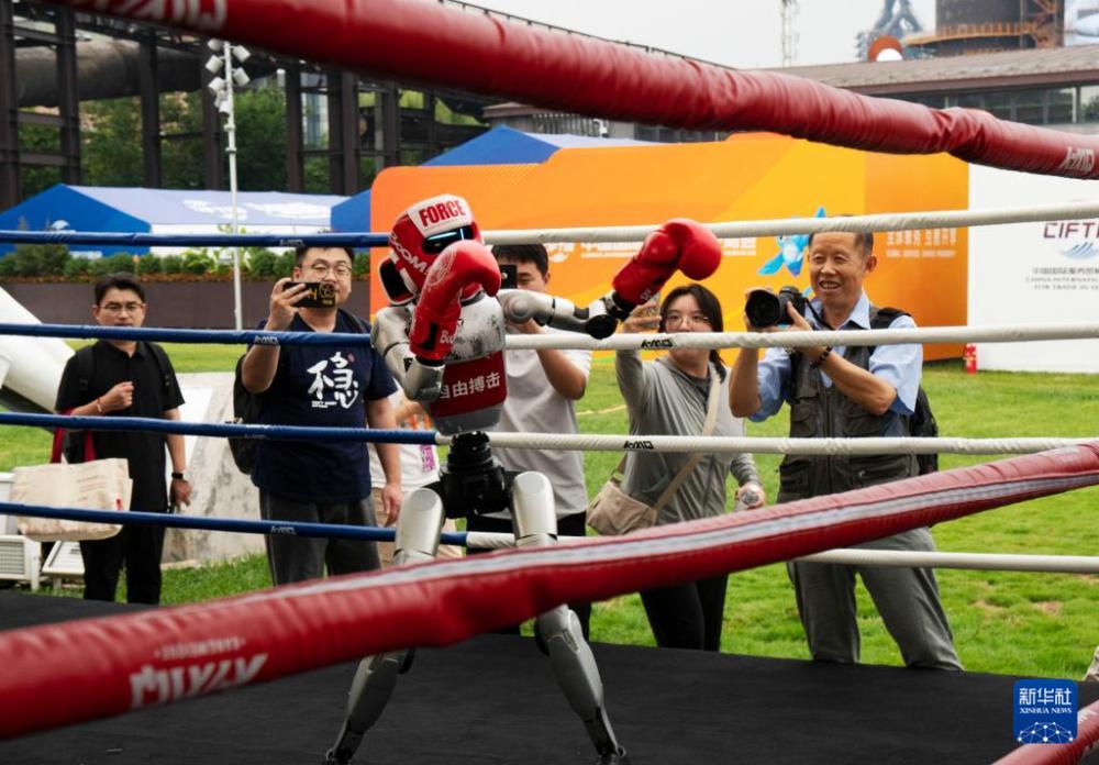 9月10日,在体育服务专题展上,观众在拍摄自由搏击机器人。