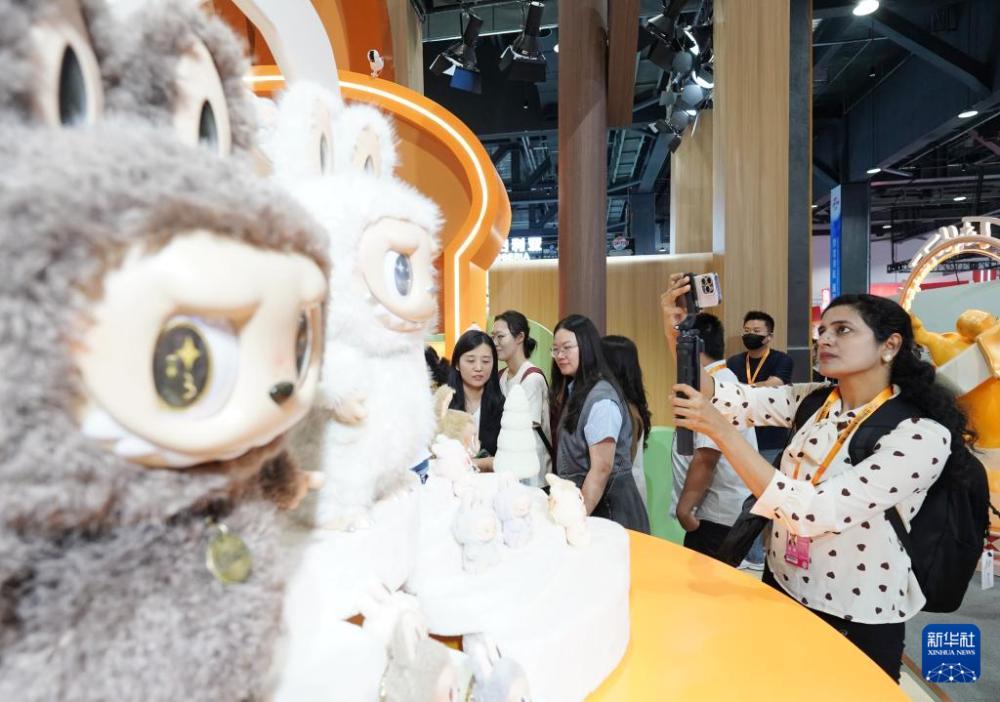 9月10日,参观者在泡泡玛特展区拍摄展品。