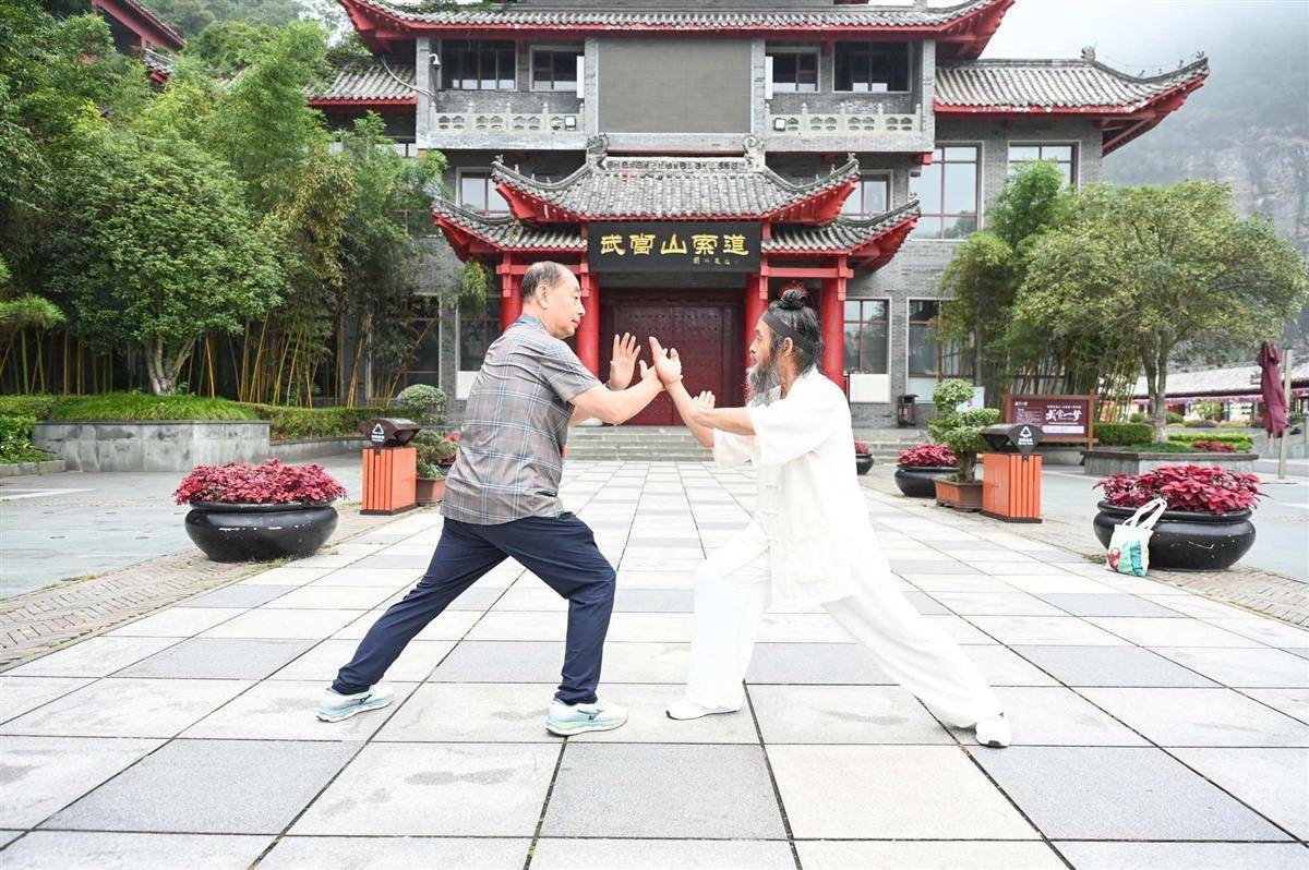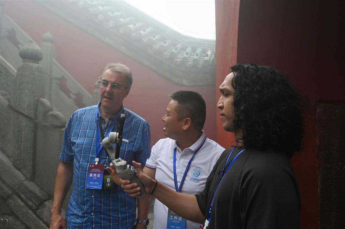 尽管天气不作美,但仍未打消旅行商的热情,在细雨迷蒙中朝着天柱峰顶的金顶攀登而上。在攀登的过程中,无处不在的道教文化和历史氛围令旅行商沉浸其中。何昂湍对道教文化感兴趣,购买了一些祈福辟秽的文创产品,还向导游咨询武当山武术学校培训班的情况;德国旅行商达莉拉在导游的指引下进入转运殿,在漆黑狭窄的神龛后侧转了一圈,这种感觉令她觉得新奇有趣,并表示以后有机会还要再来游玩;还有的旅行商在金顶摆出道教拱手礼的姿势与金顶合照,有的现场习武拍照……
