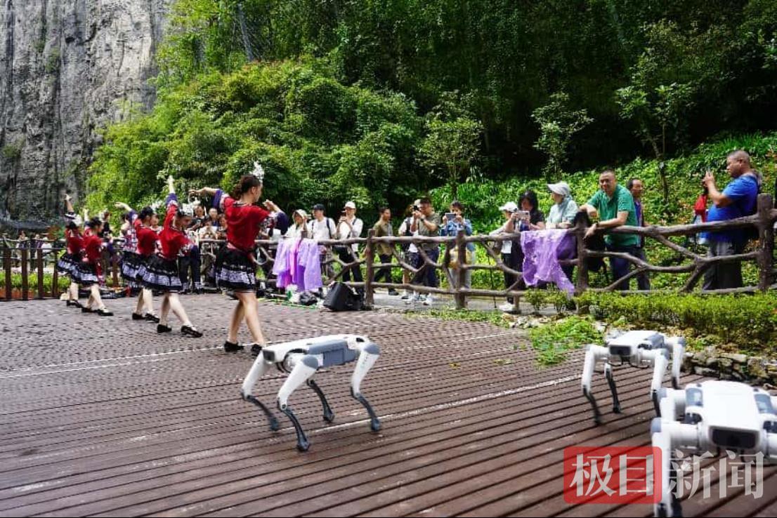 在景区迎客松处,嘉宾纷纷驻足拍摄,以清江升白云的浩渺仙境为背景合影留念。行至“一炷香”景点时,众多旅行商为这座擎天石柱的鬼斧神工惊叹不已。现场热情的土家族摆手舞与悠扬的民歌表演,更让嘉宾沉浸于浓郁的民族风情中,流连忘返。科技元素的融入成为此次考察的亮点,机器狗灵动起舞,外骨骼设备静待体验,无人机搭载VR技术提供全景俯瞰视角,使嘉宾以“上帝视角”将大峡谷的雄奇风光一览无余。
