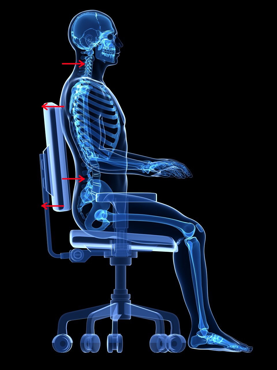 记住图片里人体脊柱的四个曲线的方向。自己感受,上身直立,腰部尽量向前挺,胸部轻微后凸,抬头但下巴略收回。根据视线方向,调整电脑屏幕位置,避免探身、低头等不良动作。