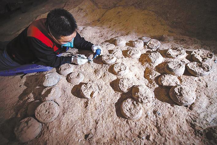 科研人员在遗址馆清理恐龙蛋化石。(受访方供图)