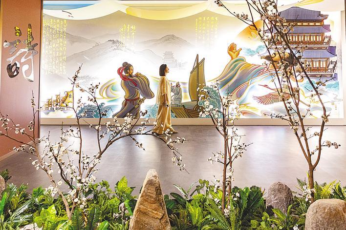 黄鹤楼历来享有“中华第一诗楼”的声誉,崔颢、李白、岳飞等900多位诗人在此写就近1500首诗词歌赋,造就了浪漫多彩、千年不衰的黄鹤楼文化。展馆特别打造了一条“诗词走廊”,以传统书法与多媒体技术相结合的方式,动态展示这些千古名篇。“展馆强化了互动体验,观众可操作360度旋转的宋、清两代‘电子版黄鹤楼’,与AI机器人即兴对诗,还有机会将合影留存于展厅内,成为展览的一部分。”黄鹤楼文化研究中心主任詹才来介绍说。