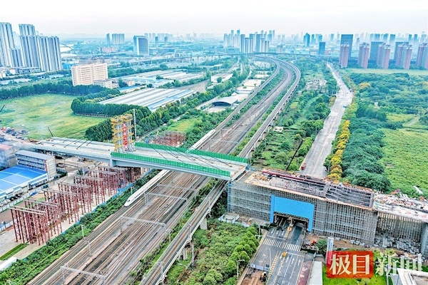 据介绍,此次转体桥施工区域环境极为复杂。桥梁上跨沪蓉、汉丹等8股繁忙铁路干线,日均通行列车超200列。桥体与铁路接触网最近距离不到1.2米,施工区域还邻近高压输电线、弱电、燃气、通信等管线,安全风险突出,管控难度极大。