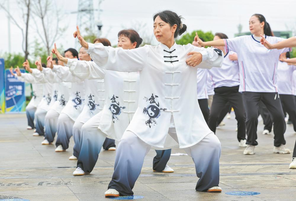 9月11日,在襄城区岘山文化广场,居民参加八段锦项目比赛。当天,2025年湖北省“百街千巷”全民健身系列赛事活动襄阳市襄城区真武山街道运动会在这里举行,吸引了当地的9个社区25支队伍参与。