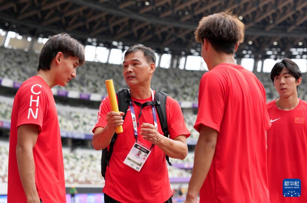 9月12日,教练谭国衡(左二)在训练中指导接力队员。