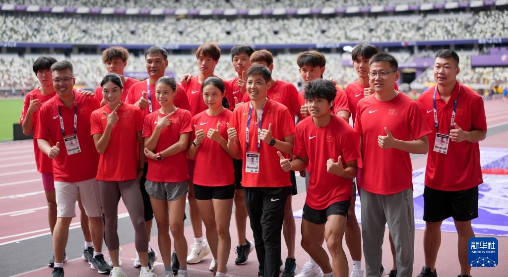 9月12日,中国田径队部分成员在日本东京国立竞技场内合影。
