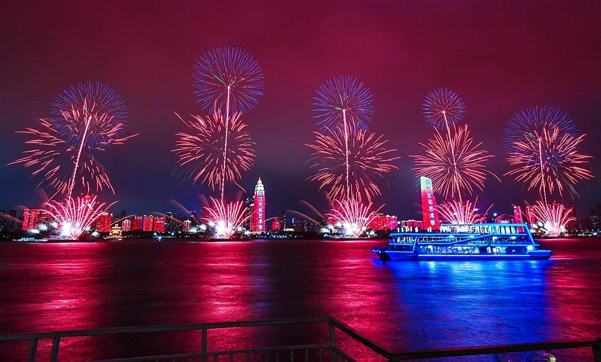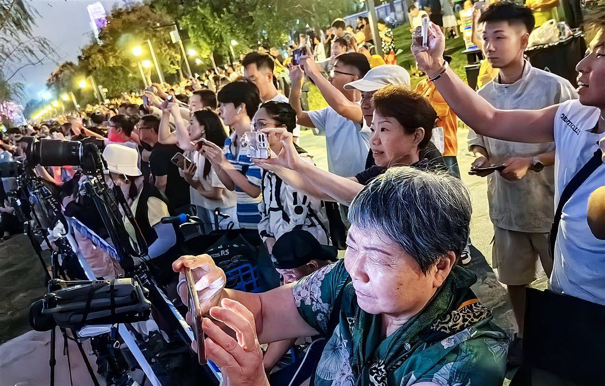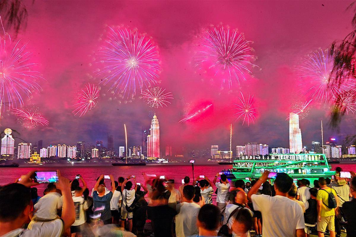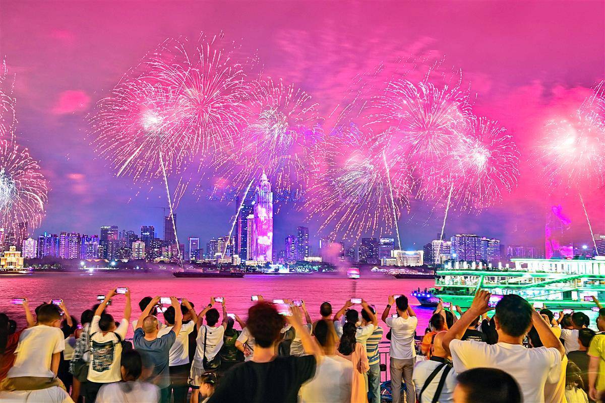 9月12日晚,大量市民游客在武昌江滩,观看2025长江文化艺术季开幕式的烟花和