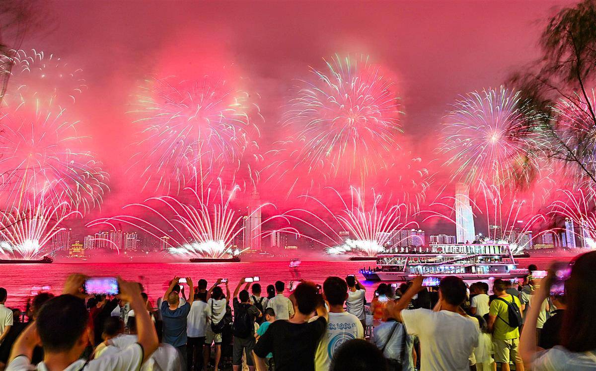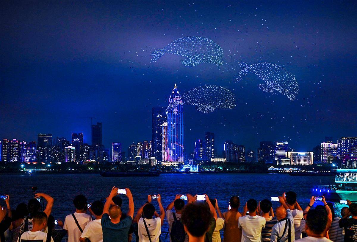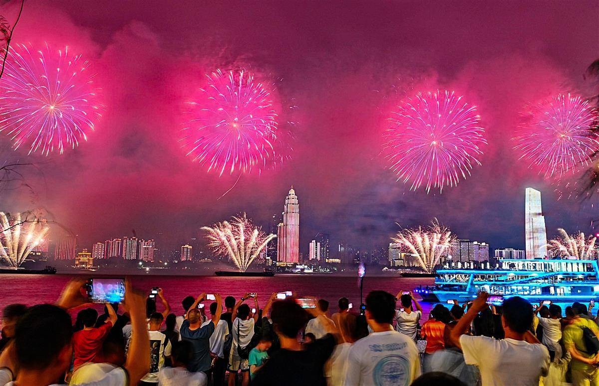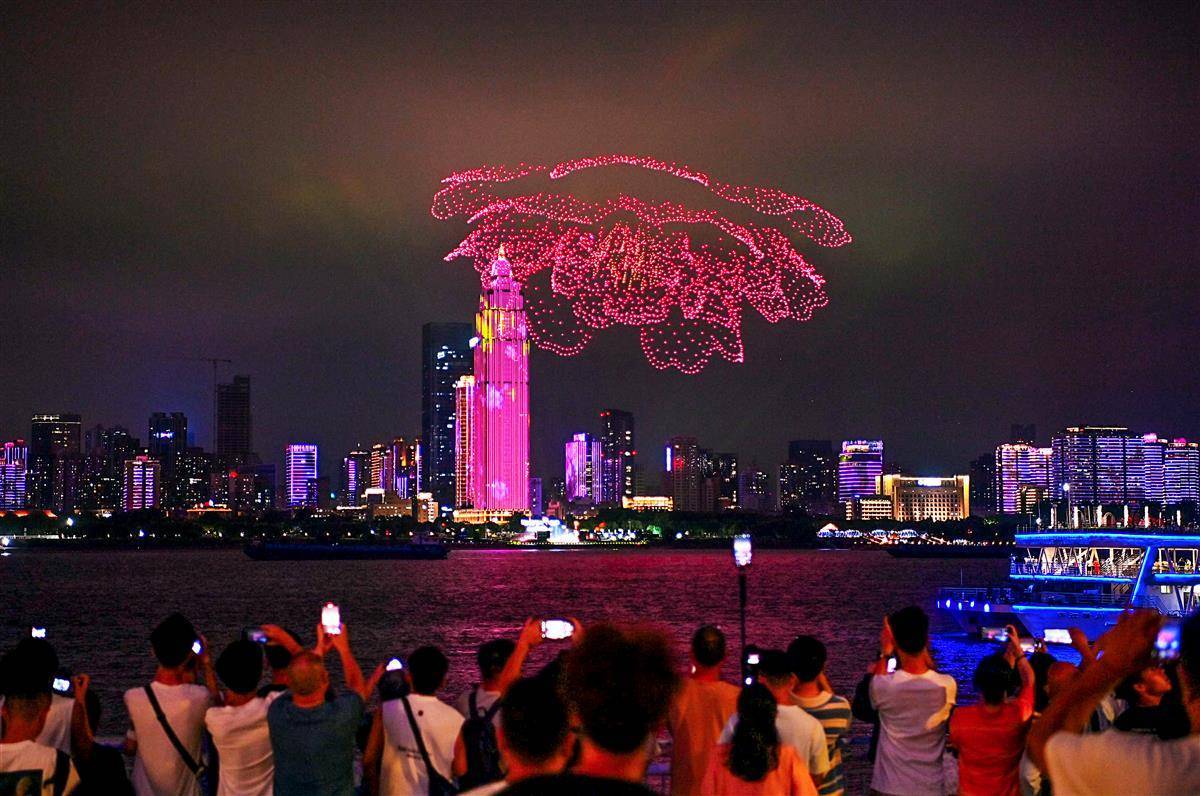 9月12日晚,大量市民游客在武昌江滩,观看2025长江文化艺术季开幕式的烟花和