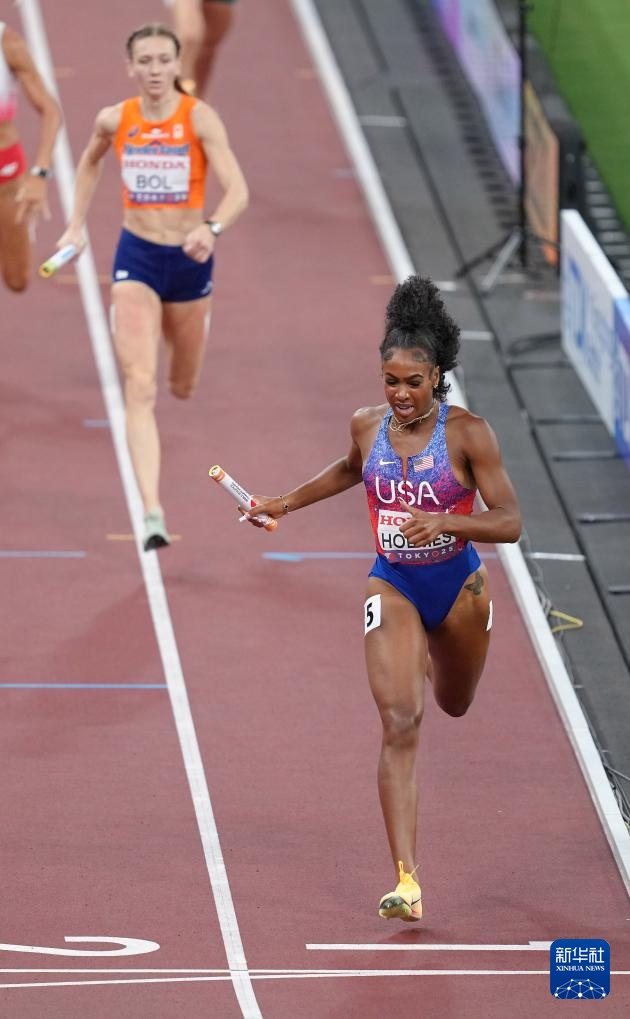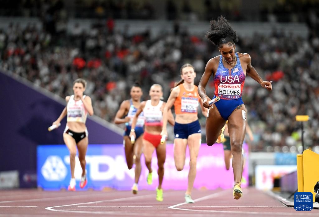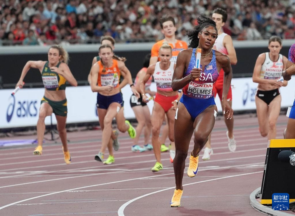9月13日,美国队第四棒选手霍姆斯在比赛中冲过终点。最终,美国队获得冠军。