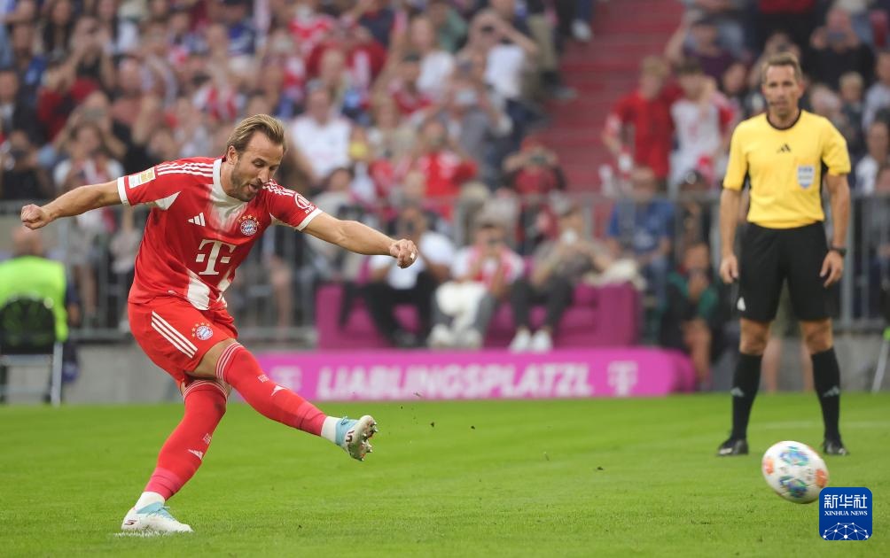9月13日,拜仁慕尼黑队球员凯恩(左)在比赛中主罚点球。