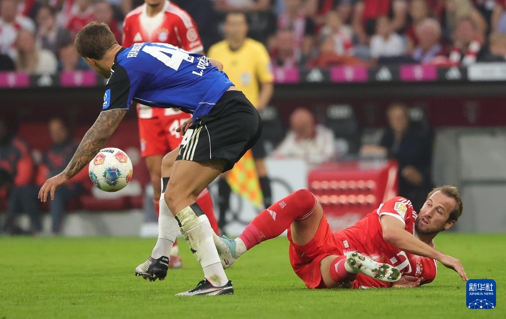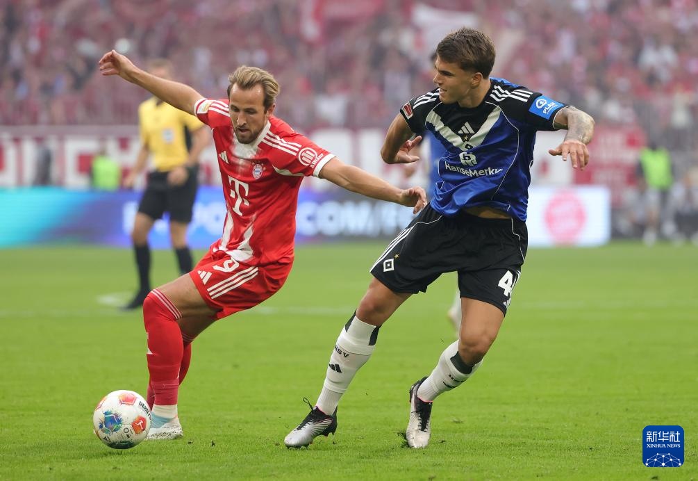 9月13日,拜仁慕尼黑队球员凯恩(右)与汉堡队球员武什科维奇在比赛中拼抢。