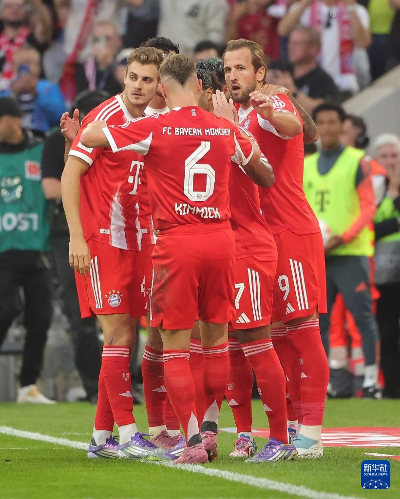 9月13日,拜仁慕尼黑队球员斯塔尼希奇(左一)、基米希(左二)、凯恩(右一)和迪亚斯在比赛中庆祝得分。