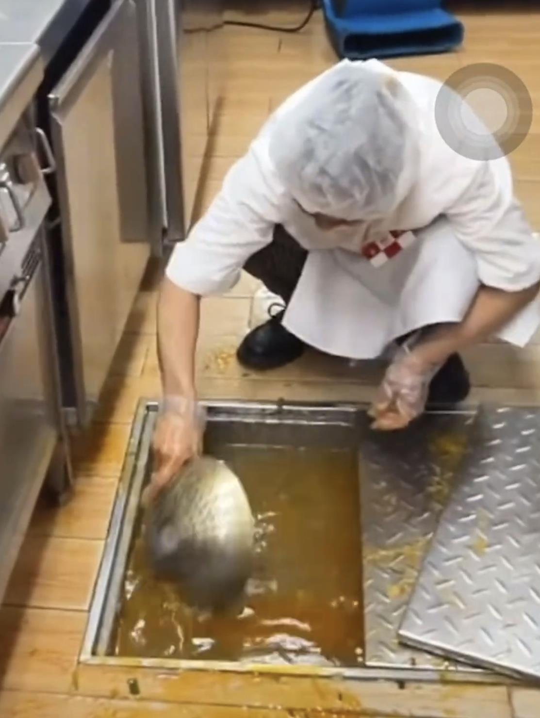9月14日,极目新闻记者注意到,一段视频中,员工用不锈钢漏勺疏通下水道,漏勺上没有明确的用途标识。另一段视频显示,下水道一旁的操作台上,锅里放着一个不锈钢漏勺,与疏通下水道的漏勺相似。