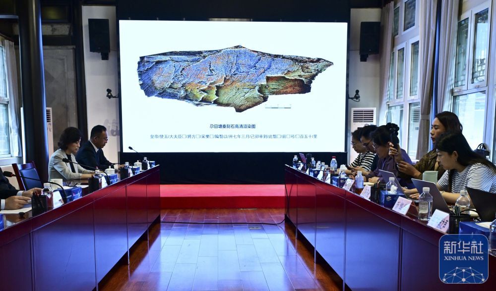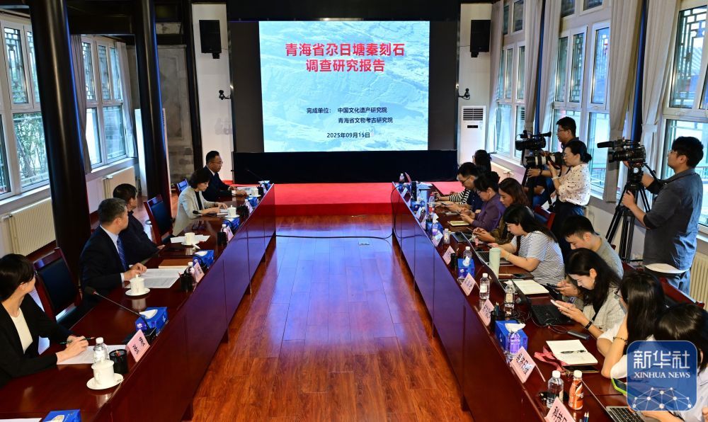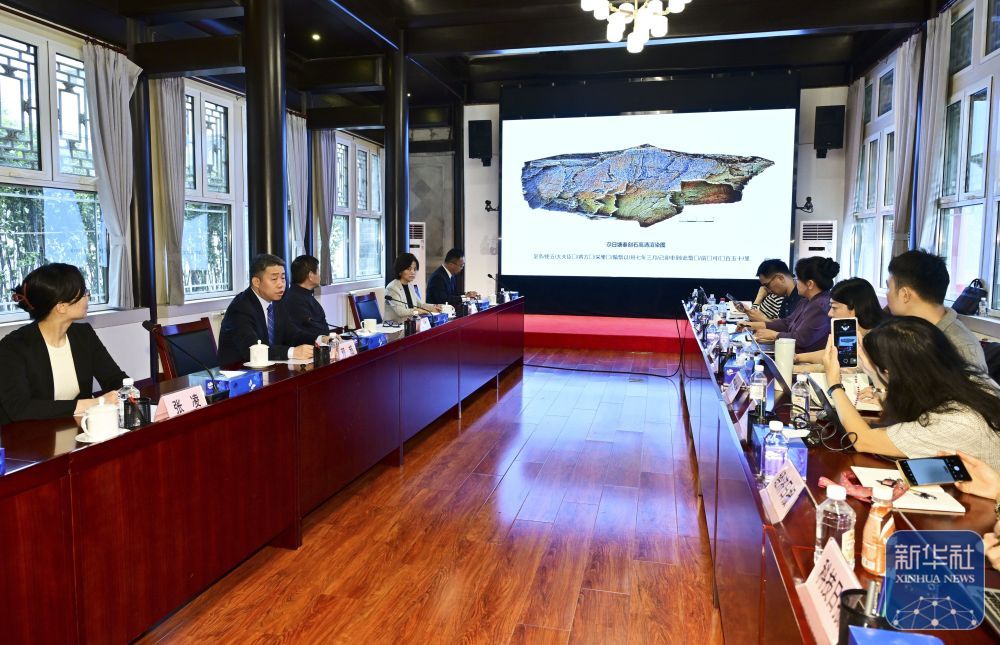 ↑ 9月15日,国家文物局在北京举行新闻发布会。确认此前在青海省玛多县发现的石刻为秦代石刻,定名为“尕日塘秦刻石”。新华社记者 李贺 摄