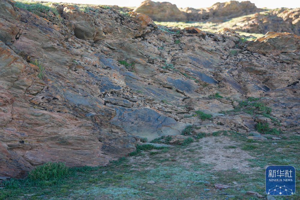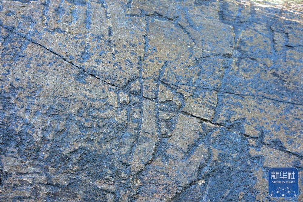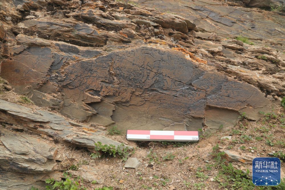 ↑ 文物考古工作者于2023年7月在青海省玛多县扎陵湖畔对尕日塘秦刻石进行现场考察时拍摄的该刻石遗迹照片。新华社发