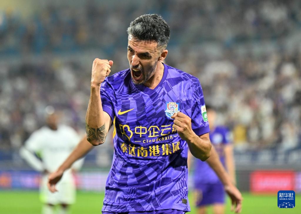 9月14日,天津津门虎队球员基莱斯在比赛中庆祝进球。
