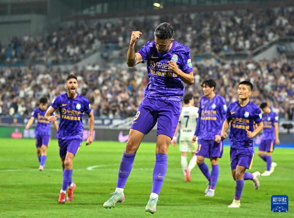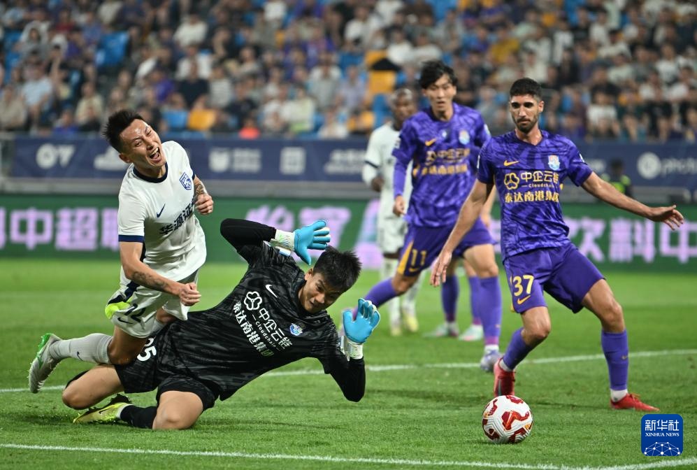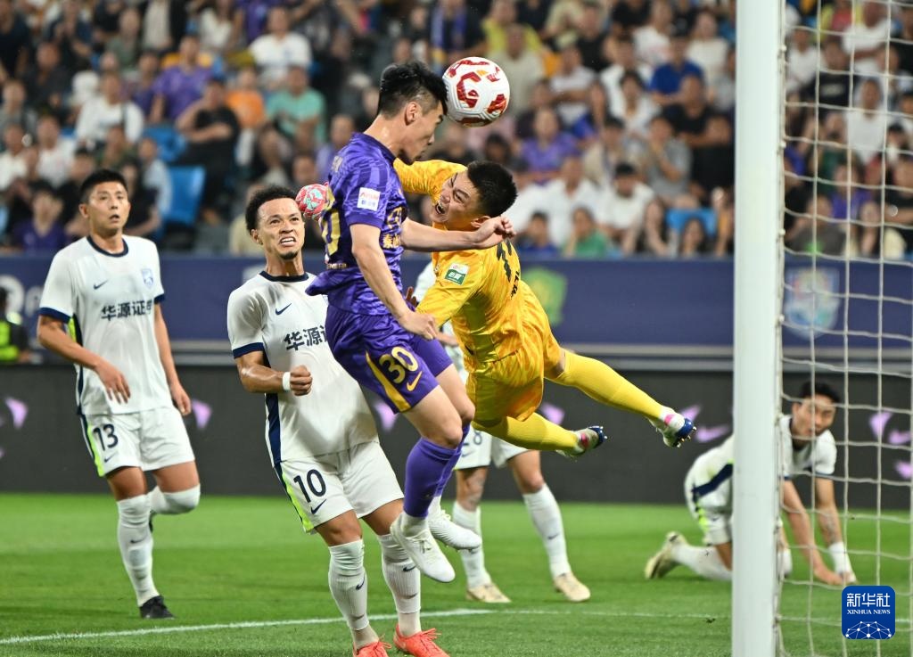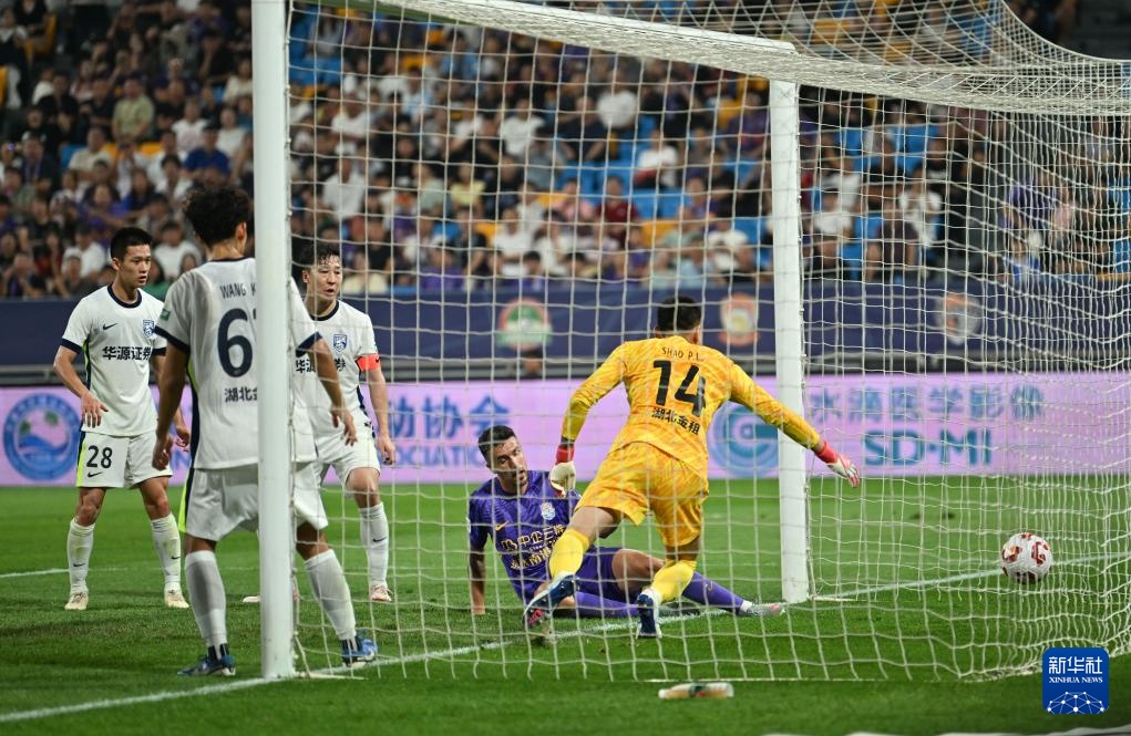 9月14日,天津津门虎队球员哈达斯(左一)在比赛中射门得分。
