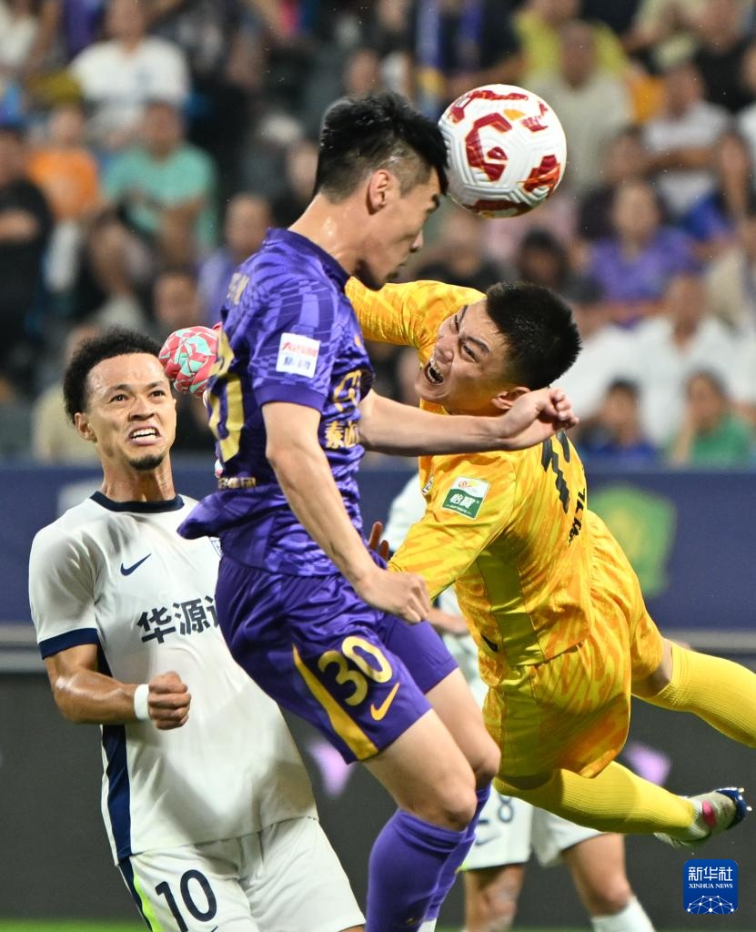 9月14日,天津津门虎队球员王秋明(中)在比赛中头球攻门得分。