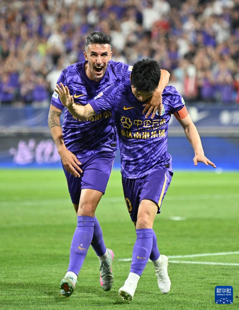 9月14日,天津津门虎队球员基莱斯(中)在比赛中庆祝进球。