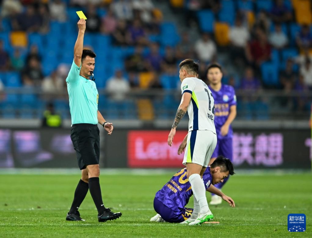 9月14日,主裁判李海新(左)在比赛中向武汉三镇队球员廖承坚(前右)出示黄牌。