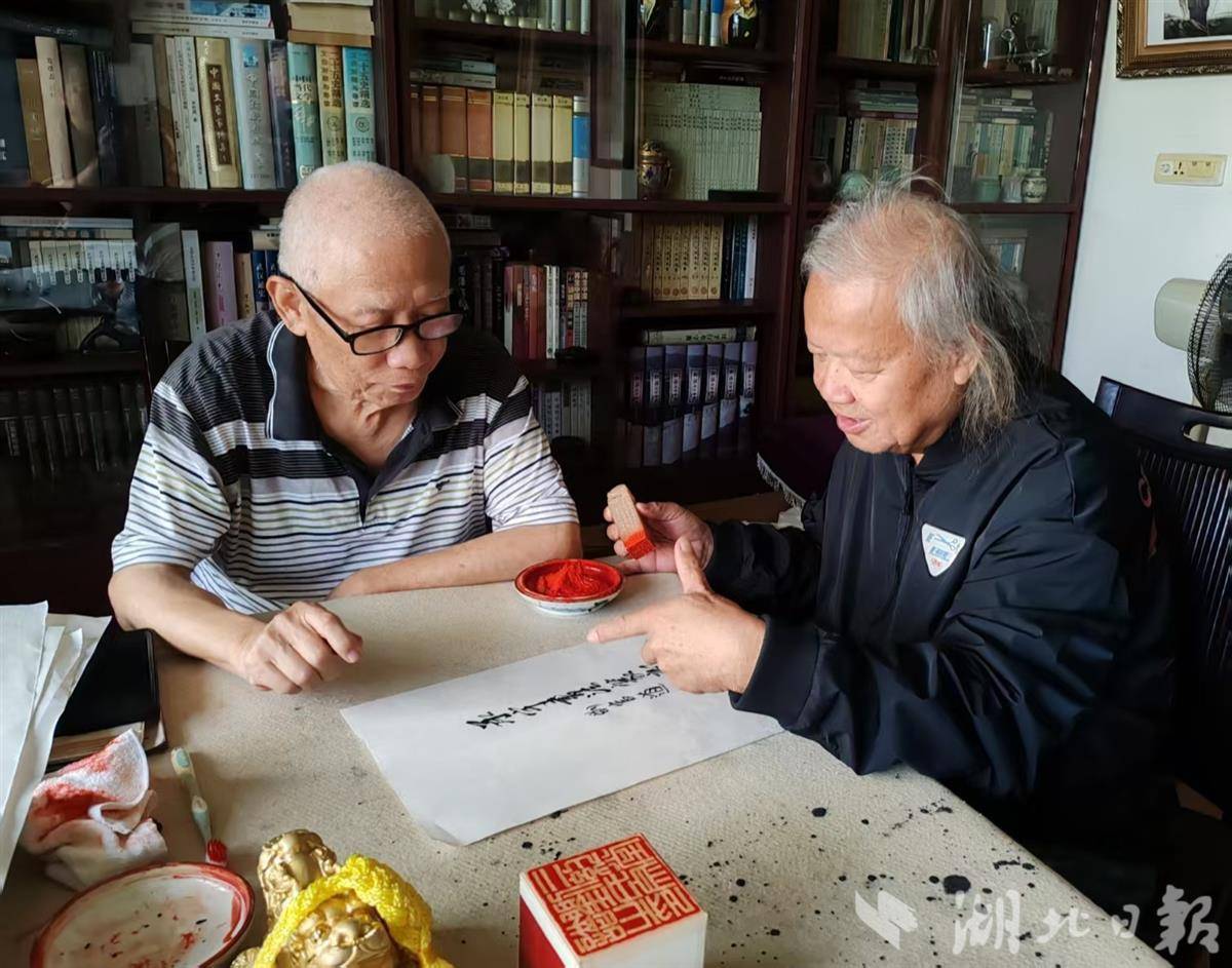 鲁家雄(右)与友人探讨书艺